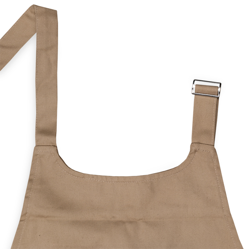Dlouhá zástěra z kvalitního pevného materiálu. V přední části je velká dvoudílná kapsa na odložení nezbytností, která se určitě při vaření hodí. Za krkem je nastavitelný popruh se sponou a vzadu zavazování.